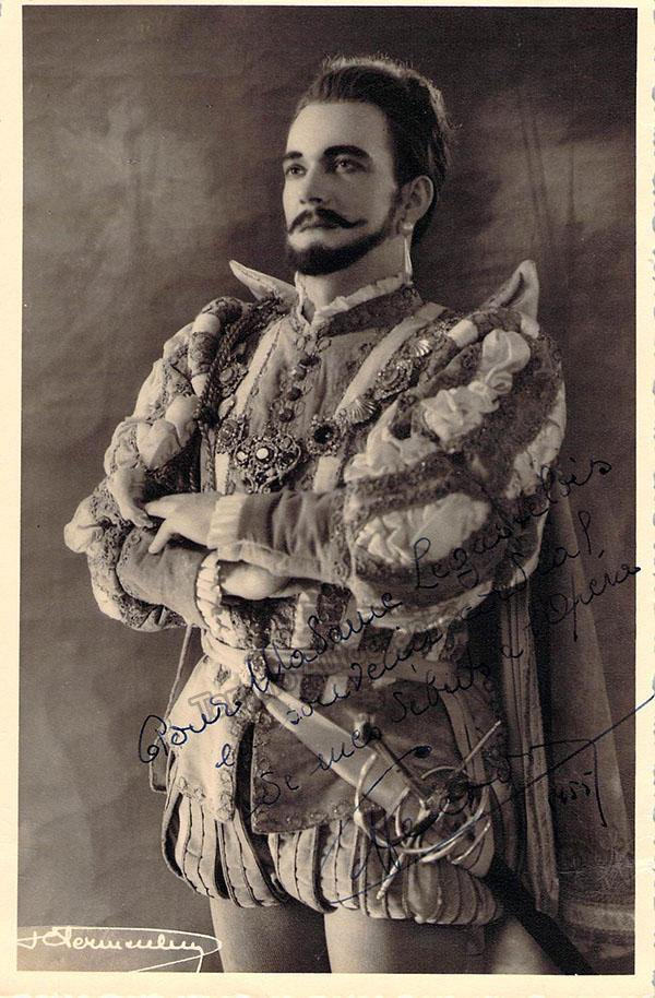 French tenor (1924-2002).  Beautiful black and white photograph shown as the Duke in Verdi's Rigoletto, signed and inscribed by him, dated in 1955.  Photo is stamped on verso by photographer Henri Vermeulen, Theatre Royal de la Monnaie.  Size is 4.5 x 7 inches, in excellent condition.