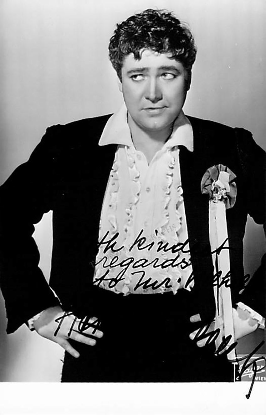 Nice black-and-white photo postcard signed and inscribed by him, shown probably in role; photo by Fayer (Vienna). Size is 3.5 x 5.5 inches, in very good condition.