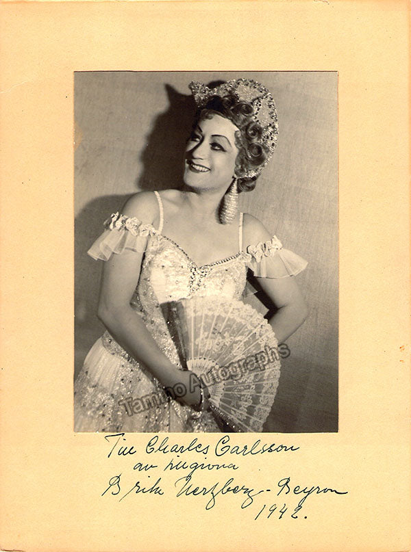 Swedish soprano (1901-1976), mother of Swedish soprano Catarina Ligendza. Signed photograph, shown in role, inscribed and dated in 1942 4.25 x 5.75 inch photo is mounted on soft cardboard, with signature directly underneath the photo, total item size is 6.5 x 9 inches, in excellent condition.
