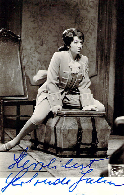 Signed photo postcard, shown in role (possibly Cherubino in Mozart's Nozze). Stamped on verso by photographer Fayer, Vienna. Size is 3.25 x 5.25 inches, in excellent condition.