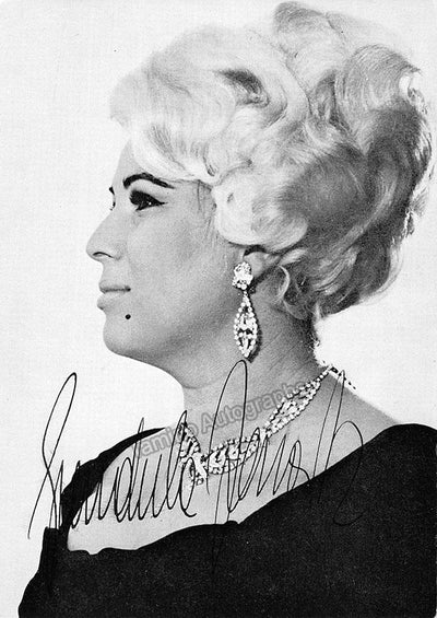 Nice black-and-white photo postcard signed by her, shown in costume for one of her operatic roles. Size is 3.5 x 5.4 inches, photo by Fayer (Vienna), in excellent condition.