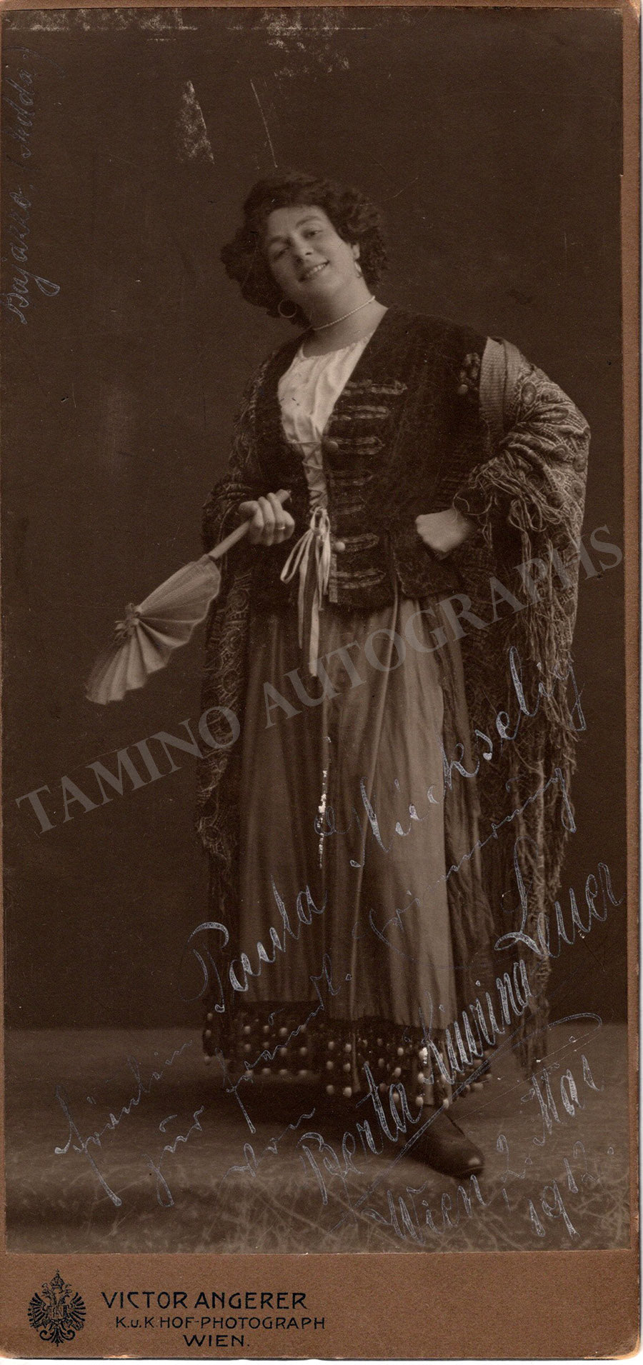 An original vintage cabinet photo by Victor Angerer (Vienna) featuring Kiurina probably in one of her opera roles, signed and inscribed by her with a short sentiment dated in Vienna, 1912.
