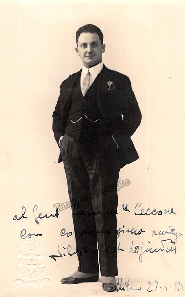 Italian tenor (1895-1982), signed photo postcard, shown as himself. Inscribed. Blind stamped on front by photographer Zancolli. Size is 3.3 x 5.3 inches, in excellent condition.