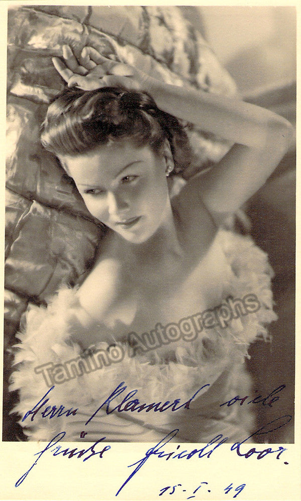 German soprano (1919-?), signed photo postcard, shown as herself. Inscribed and dated in 1949. Stamped on verso by photographer Olga Wlassics, Vienna. Size is 3.25 x 5.25 inches
