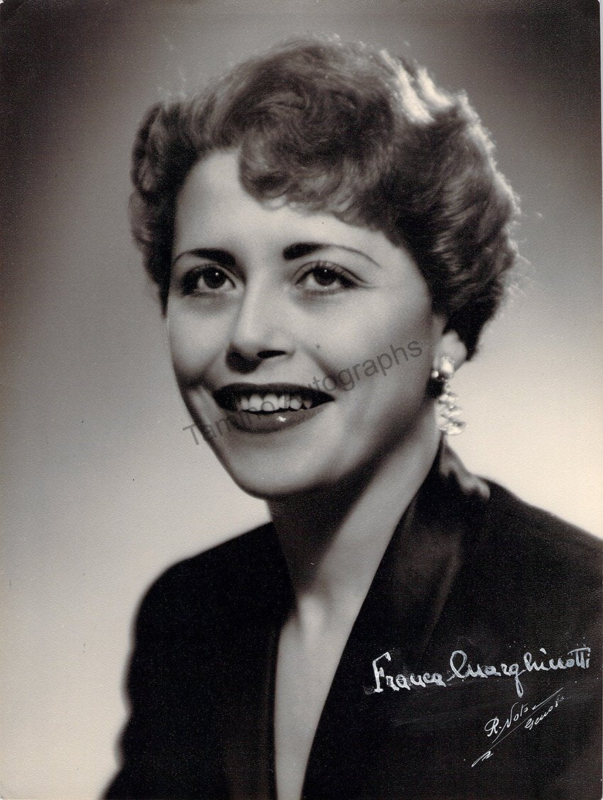 Italian mezzo-soprano.  Signed photo shown as herself. Signed on front and stamped on verso by Renato Nolo photo studio, Genova. Size is 7 x 9.25 inches, in excellent condition.