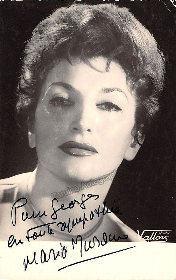 French mezzo-soprano (1918-2009), signed postcard photograph, shown as herself. Inscribed. Photo by Studio Vallons, Paris. Size is 3.5 x 5.5 inches, slight creases and paper loss, otherwise in very good condition.