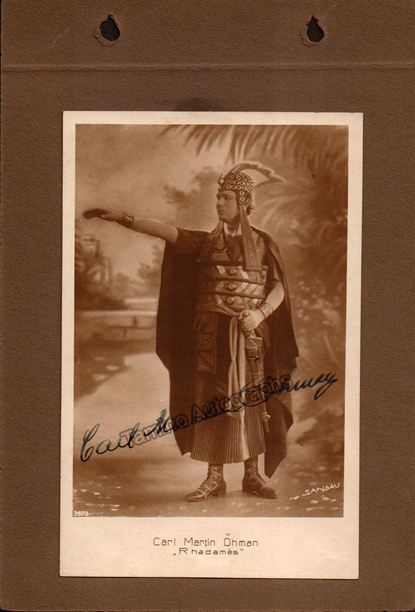 Nice sepia promo photograph signed by him, shown as Radames in Verdi's Aida, mounted on a larger piece of flexible cardboard. Total size is 4.75 x 7 inches, actual photo is 3.4 x 5.25 inches, in excellent condition.