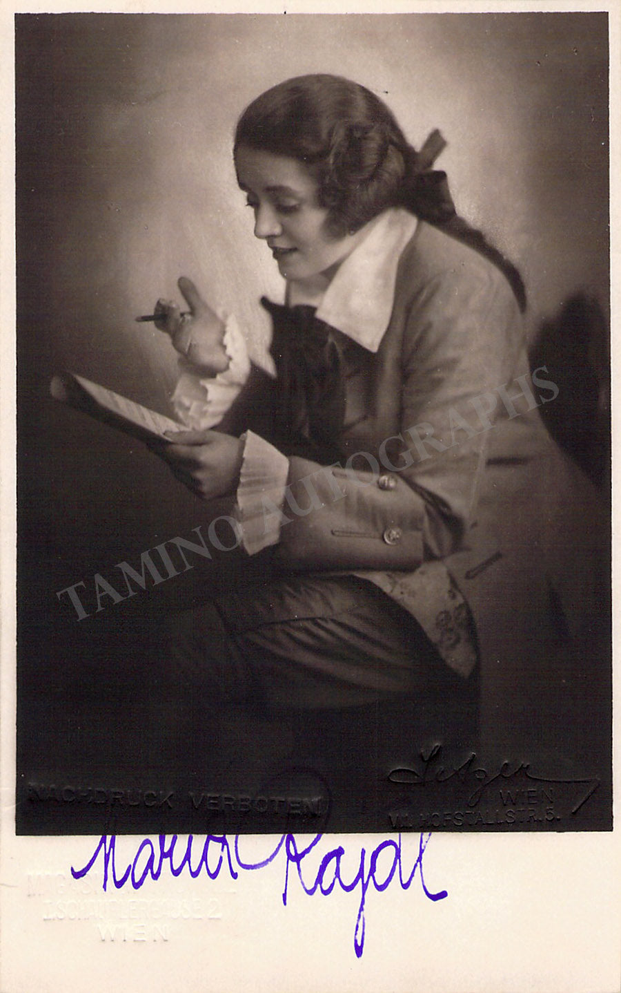 Signed postcard photograph, shown as the Composer in Richard Strauss's Ariadne auf Naxos. Bold handwriting and signature. Blind stamped on front by Magasin Metropole photo studio, Vienna and stamped on verso by photographer Setzer, Vienna. Size is 3.25 x 5 inches, in excellent condition.
