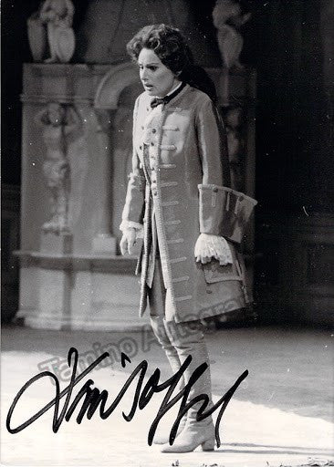 German mezzo-soprano (b.1948).  Signed photo shown in role. Stamped on verso by photographer Harri Irmler, Berlin. Size 4 x 5.75 inches, in very good condition.