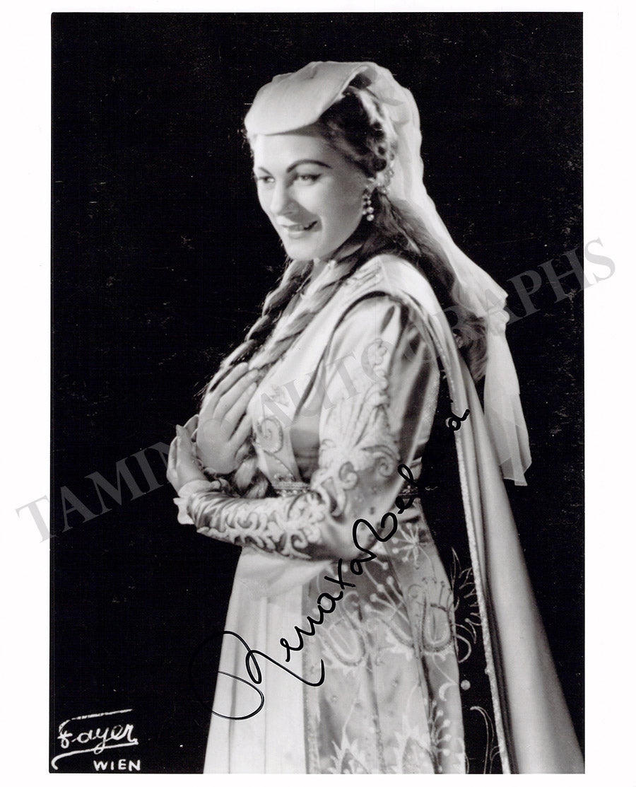 Beautiful black-and-white photo postcard signed by her, shown as Tosca in Puccini's opera in Vienna (1958). Size is 4.1 x 5.8 inches, in excellent condition.