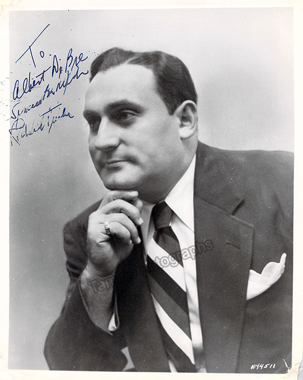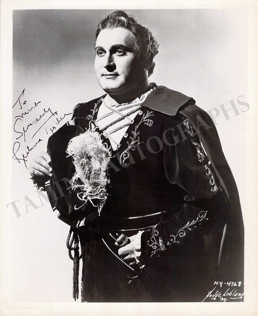 Gorgeous black-and-white photograph signed by him with a short sentiment, shown as Don Alvaro in Verdi's 'La Forza del Destino', ink-stamped on verso by photographer Sedge Leblang. Size is 8 x 10 inches, in excellent condition.