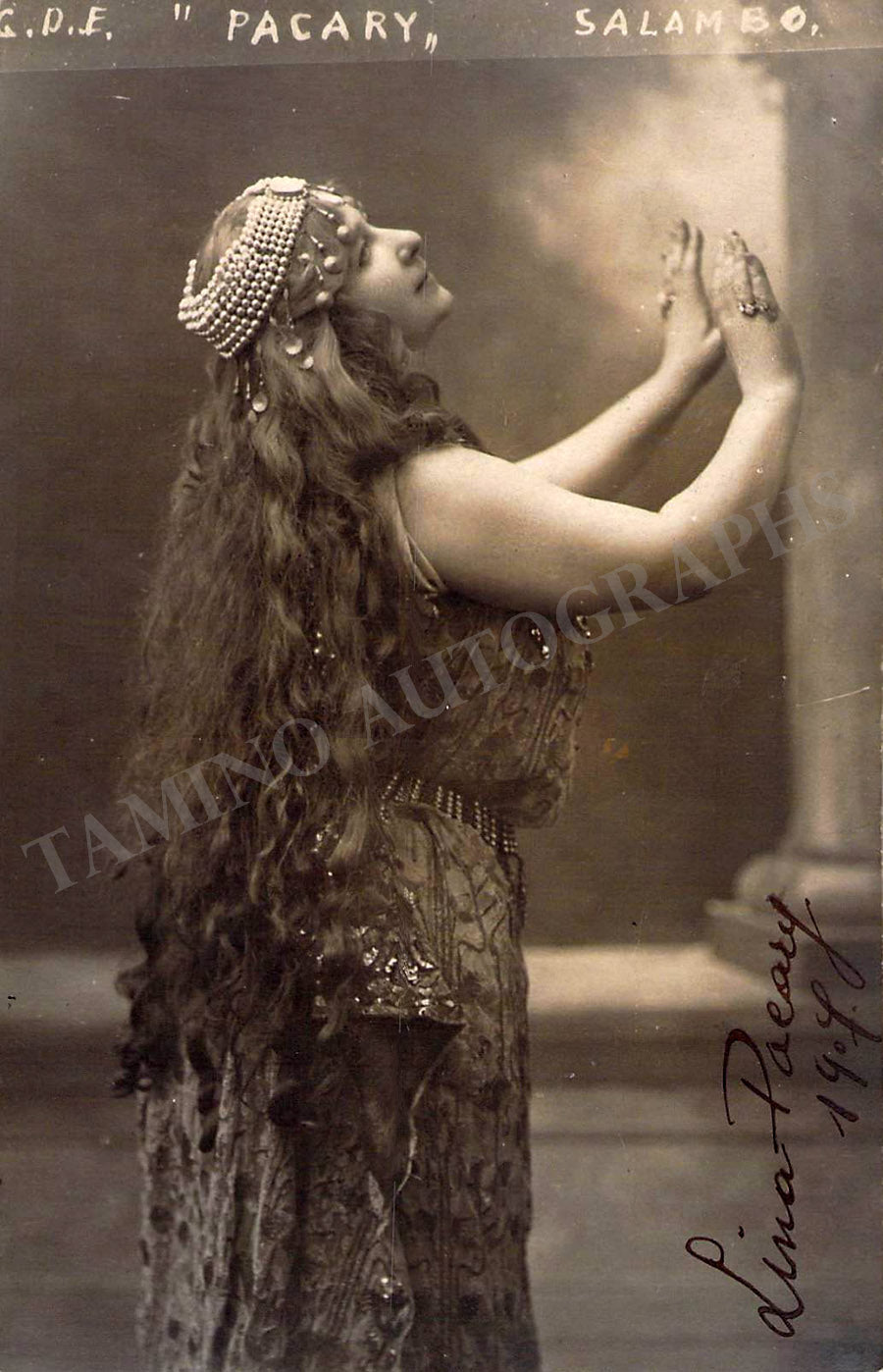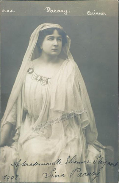 Signed photo postcard, shown as Ariane in the opera of the same name by Massenet, inscribed and dated in 1908. Size is 3.5 x 5.5 inches, in excellent condition.