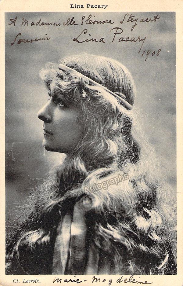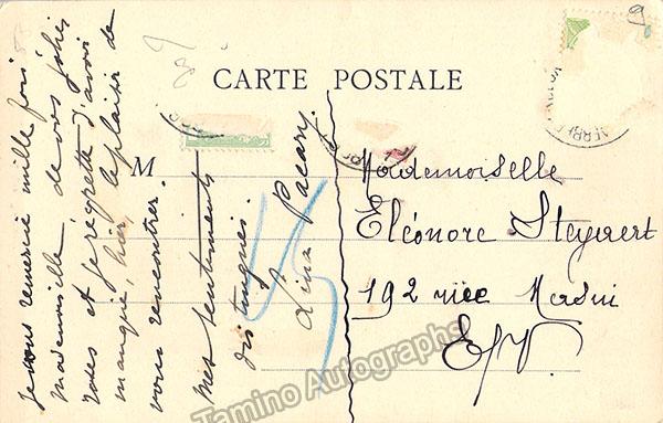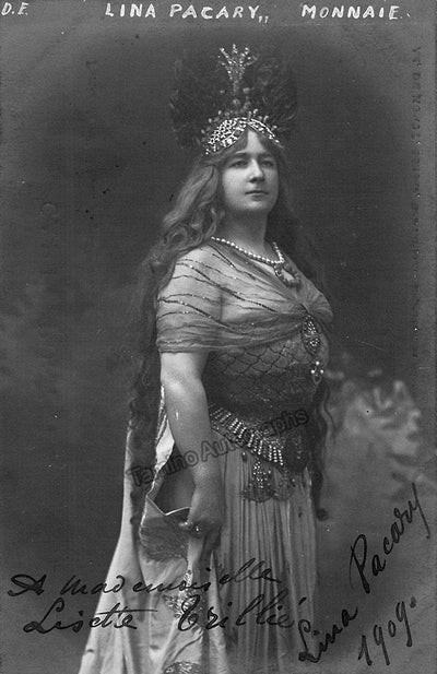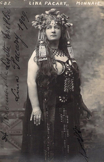 Signed photo postcard, shown in role. Inscribed and dated in 1909. Photo by De Hondt, Brussels. Size is 3.5 x 5.5 inches, some silvering at edges of photo, otherwise in excellent condition.