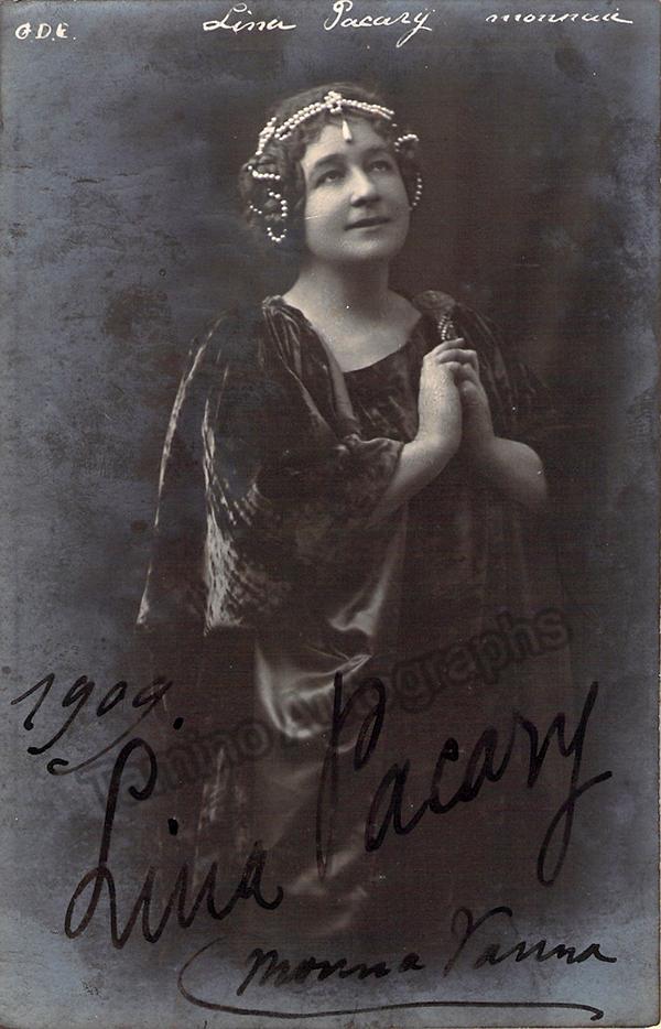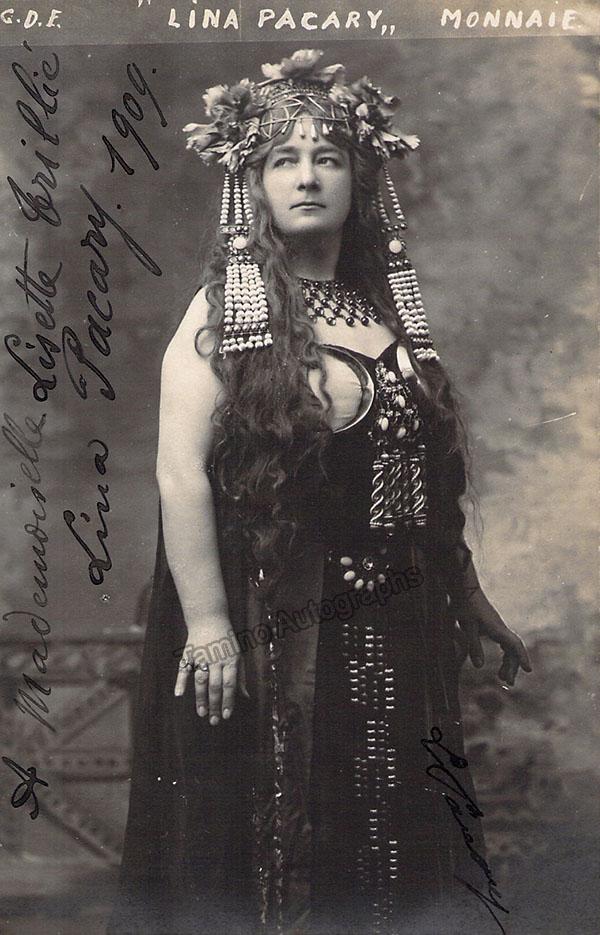 Signed photo postcard, shown in role. Inscribed and dated in 1909. Photo by M. Wagener-Geraerts, Brussels. Size is 3.5 x 5.5 inches, in excellent condition.
