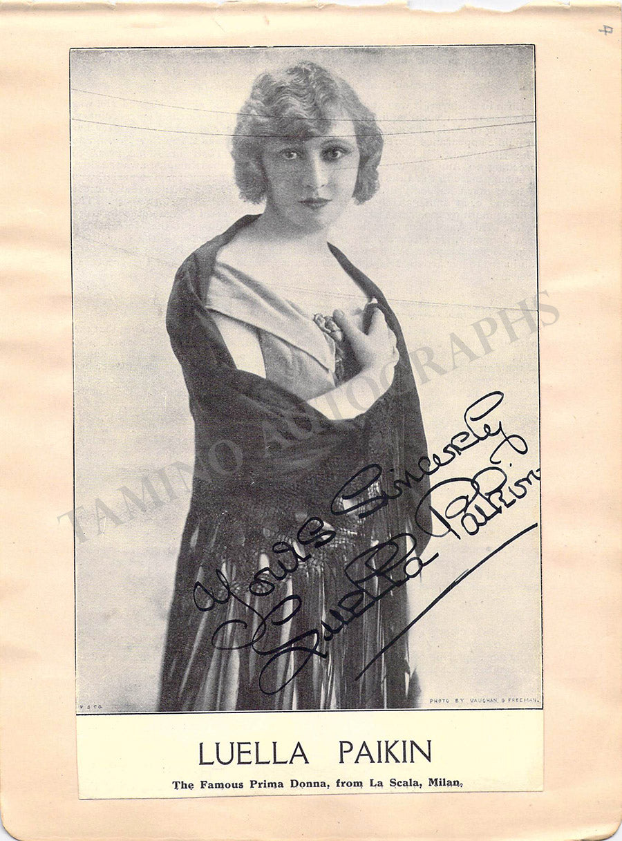 British soprano (1900-?), signed half-tone photograph, shown possibly in role. Bold handwriting and signature. This is a 4.25 x 6.75 inch publicity photo probably taken from a magazine or program mounted onto soft cardboard, total item size is 6.75 x 7.5 inches, in excellent condition.