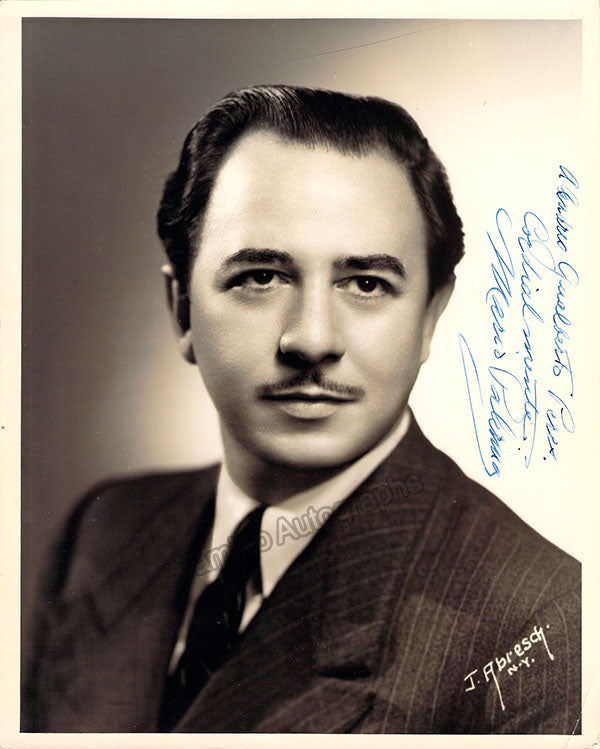 Tenor active with the touring San Carlo Opera Company in the 1930s and 40s. Signed photograph, shown as himself, inscribed. Stamped on verso by photographer James Abresch, New York. Size is 8 x 10 inches, small creases on corners, otherwise in very good condition.