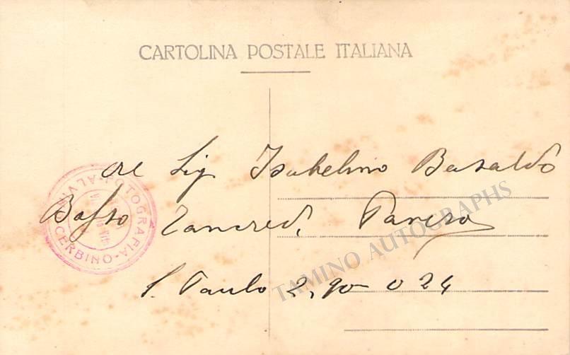 Italian bass (1893-1983), signed photo postcard, shown as himself, signed and inscribed on verso and dated in 1924. Stamped on verso by photographer Alvino Cerbino. Size is 3.25 x 5.25 inches, very slight silvering on corners but otherwise in excellent condition.