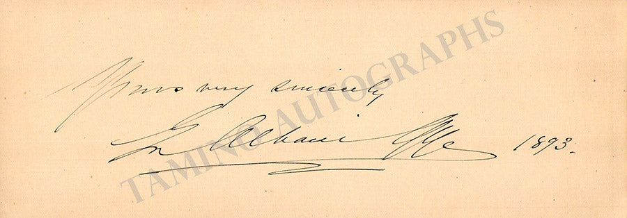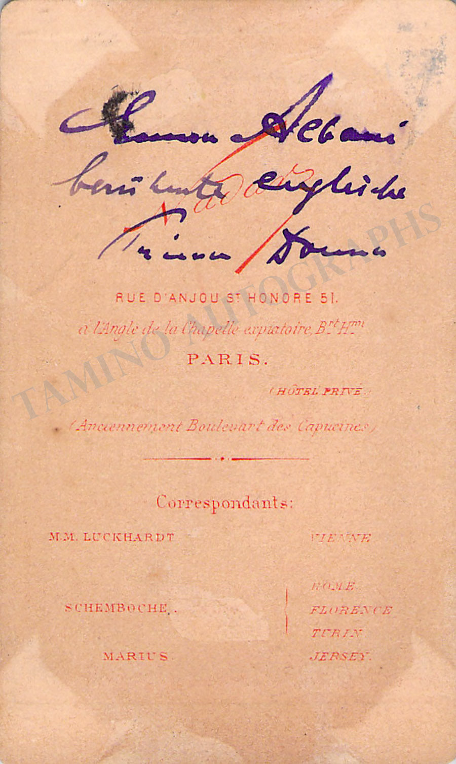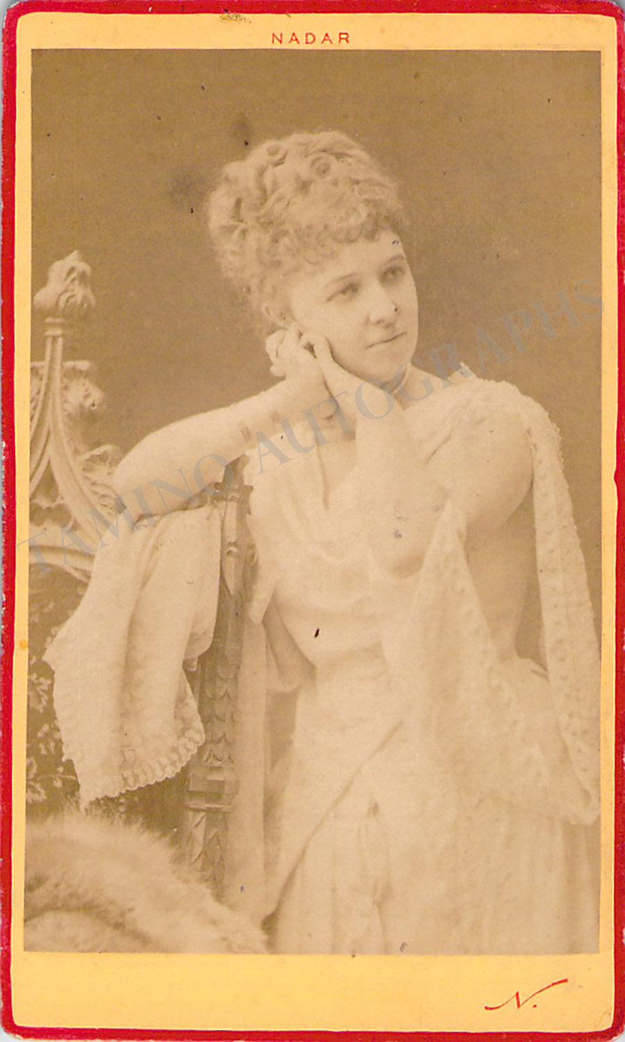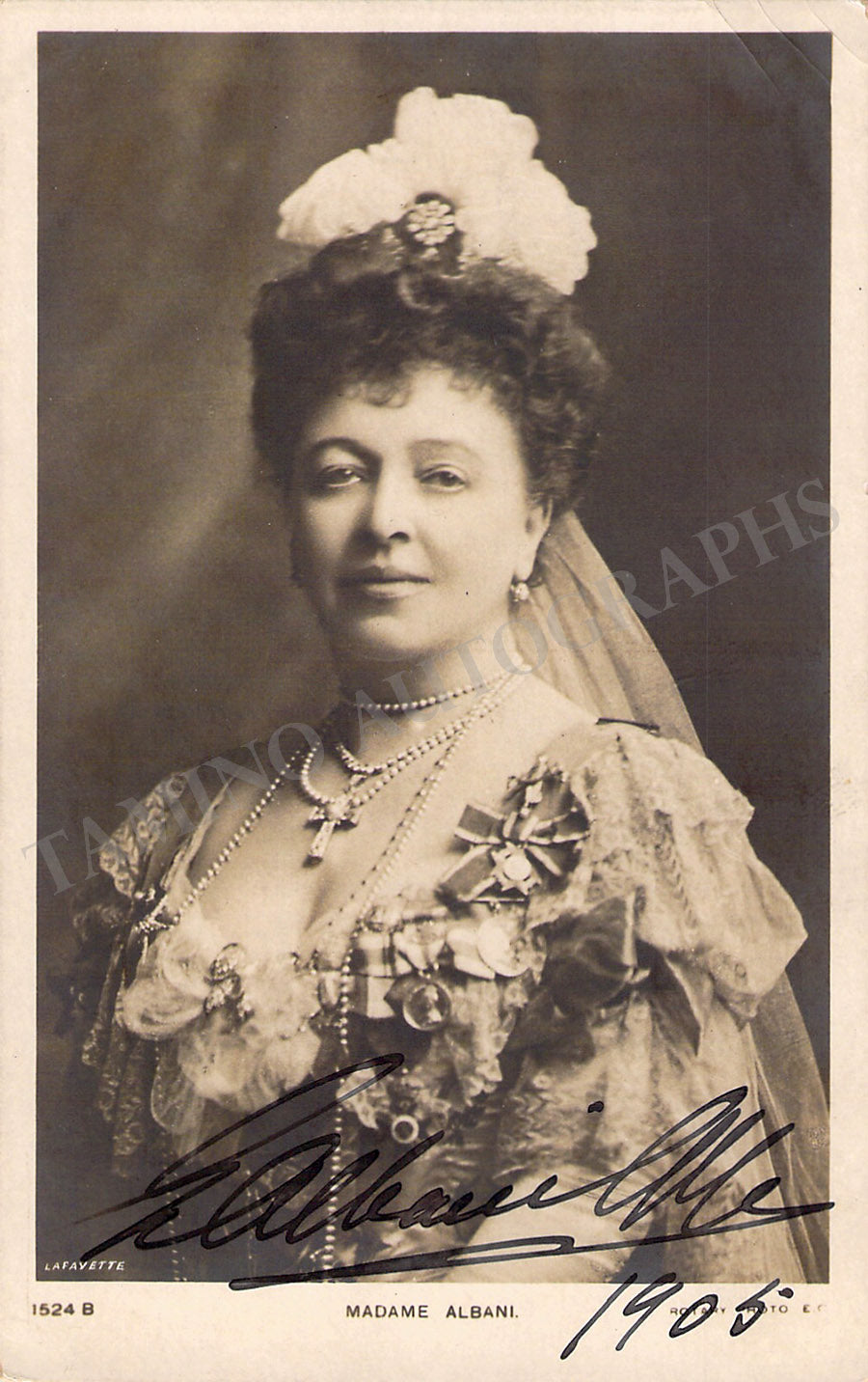 Beautiful collection of 7 items as follows: 2 signed photo postcards dated 1905 and 1911 (3.3 x 5.3 inches approx.), 1 signed card dated 1893 (8.3 x 2.9 inches), 1 unsigned mini CDV by Nadar (2.5 x 4.1 inches), 2 unsigned photo postcards (3.5 x 5.3 inches), and 1 unsigned cabinet photo by Warden featuring Albani in role (4.25 x 6.5 inches).