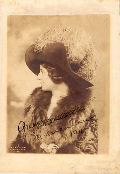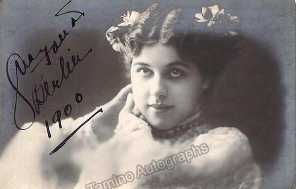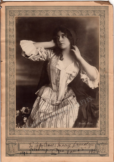Black-and-white photograph signed by her in 1901, shown as Gretchen (Gounod's Faust); photo by Gerlach & Co. (Berlin). Size is 7.6 x 10.75 inches, facsimile signature over the lower-right corner, some damage over borders, in very good condition.