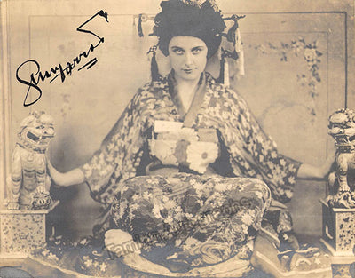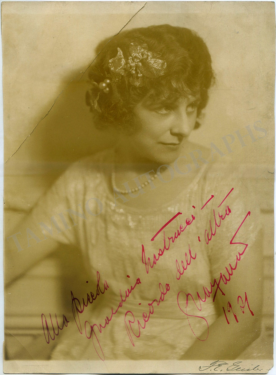 Gorgeous black-and-white photograph signed by her with a short sentiment dated 1907, shown in the title role of Puccini's Madama Butterfly. Size is 7.8 x 10 inches, mounting and minor damages on verso, otherwise in very good condition.