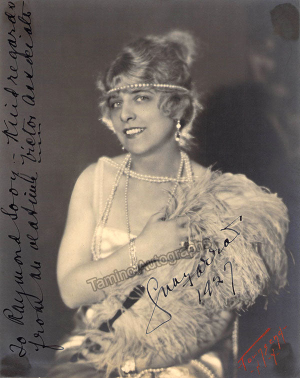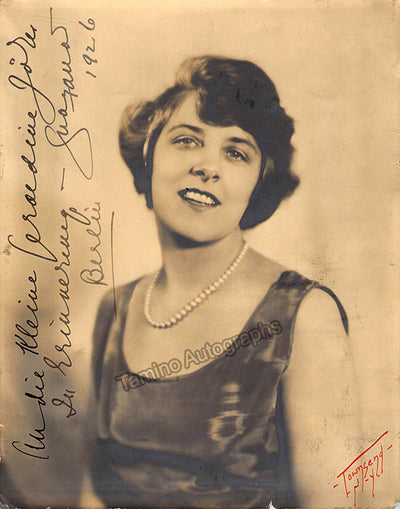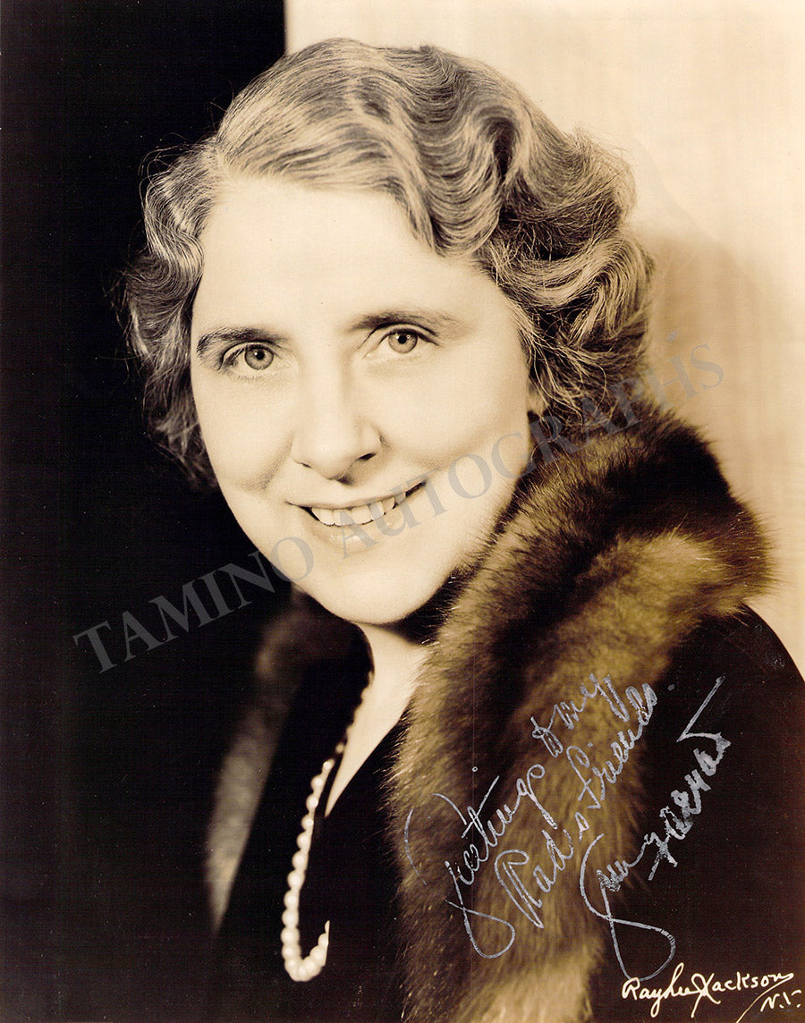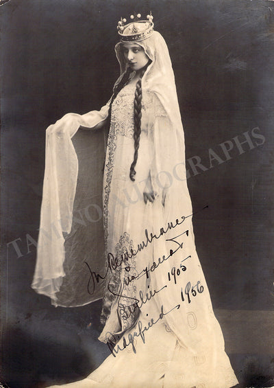 Fine black-and-white photograph signed by her with a short sentiment in Philadelphia, 1956, shown here as Elsa in Wagner's 'Lohengrin' at Berlin, 1905. Size is 7.8 x 11.1 inches, silvering around borders, in overall very good condition.