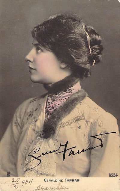 Beautiful black-and-white photo postcard signed by her, shown in role in Mascagni's opera Amica. Size is 3.3 x 5.3 inches, in excellent condition.