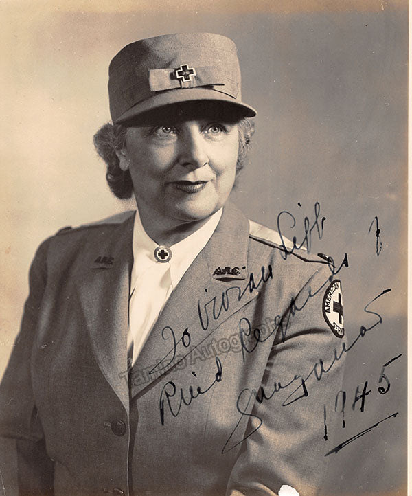 Signed photograph, shown as herself in the uniform of the American Red Cross, inscribed and dated in 1945. Size is 7.25 x 9 inches, small crease on bottom left, otherwise in very good condition.