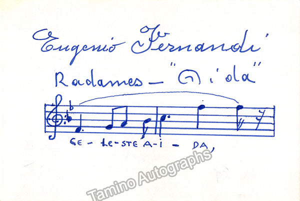 ALSO INCLUDED: Autograph musical quote signed of the first bars of "Celeste Aida" Radames' aria in Verdi's Aida.  Musical quote is on front side of a 4 x 6 inch card, with Fernandi's clear and bold signature just above the musical quote. Both items in excellent condition, not sold separately.