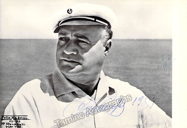 Signed postcard photograph, shown as himself on a boat, dated in 1954. Stamped on verso by photographer Antonio Margiotta, Rome. Size is 4 x 5.75 inches, in excellent condition.