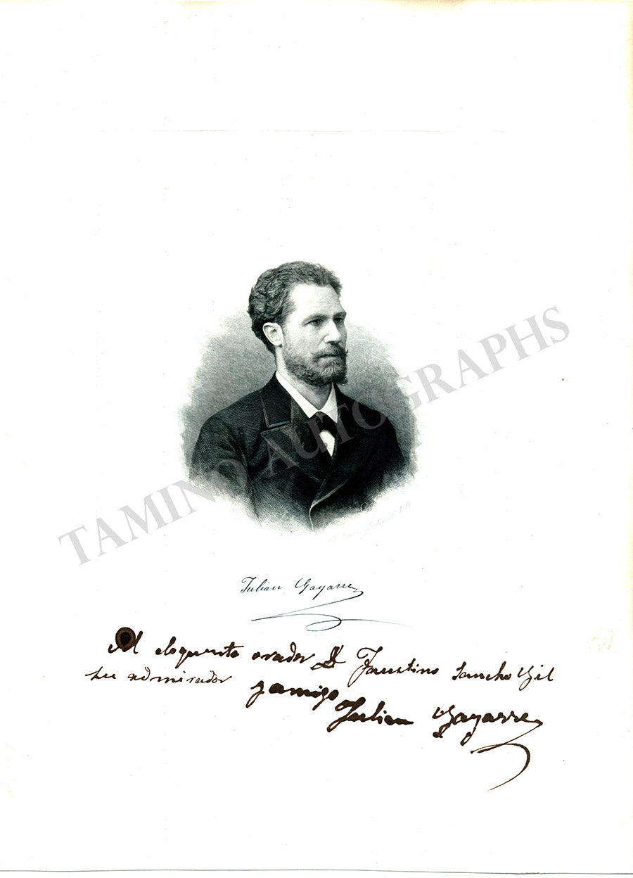 Larger size engraving print of Gayarre by B. Maura (Madrid, 1880), boldly signed by the star tenor, inscribed to the Spanish author and speaker Faustino Sanchez Gil (1850-1896).  Size is 12.25 x 16 inches, minor rust stains on edges, otherwise in excellent condition.