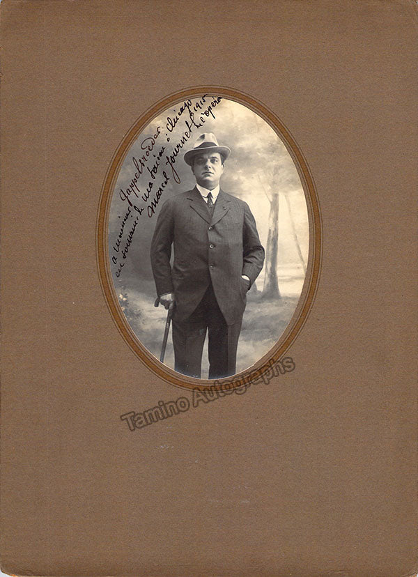 Beautiful photograph signed and inscribed by him, dated in 1915. Circle-shaped photograph with a size of 4 x 5 inches, mounted onto a larger cardboard piece for a total size of 8 x 11 inches, beautifully preserved, in excellent condition.