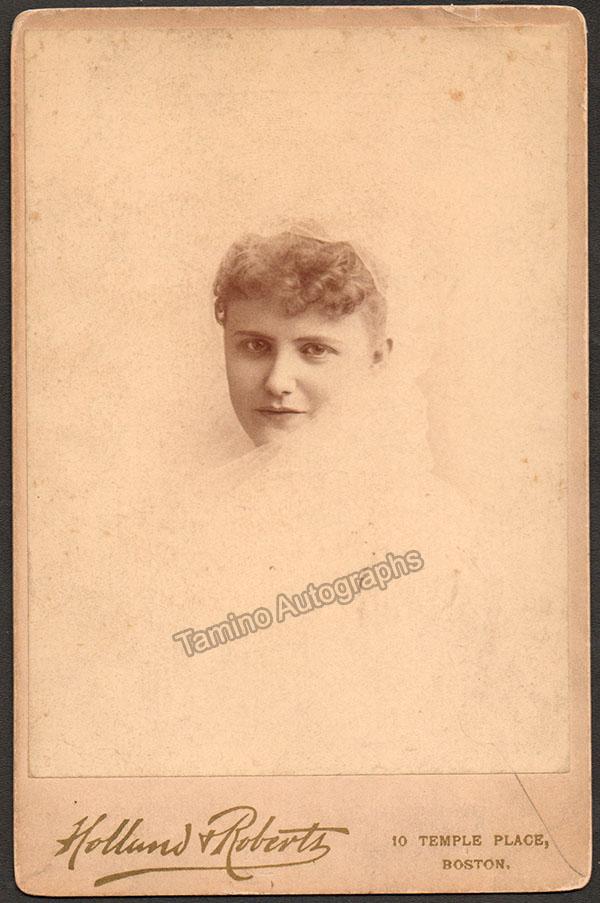 Fine cabinet photograph signed and inscribed by her, dated on verso in Boston, 1888, shown probably in role; photograph by Holland Roberts, Boston. Size is 4.25 x 6.5 inches, in excellent condition.