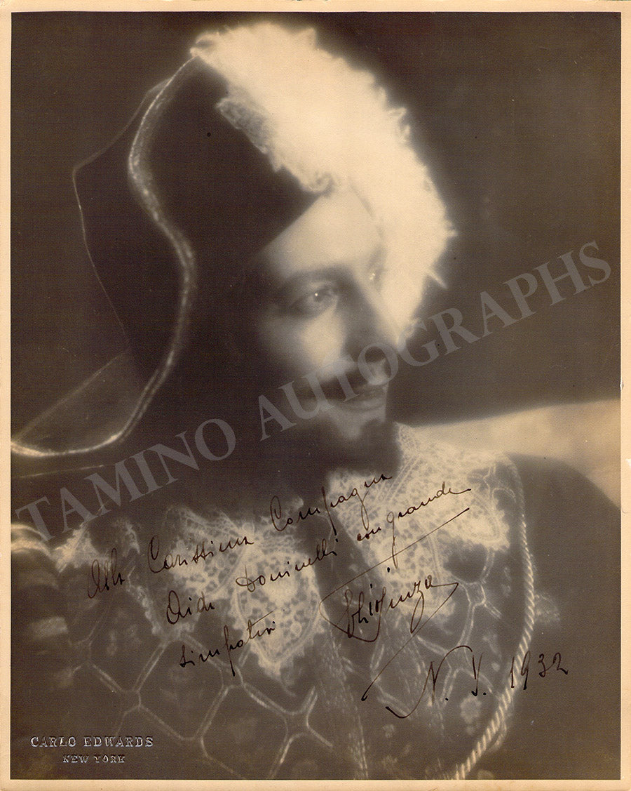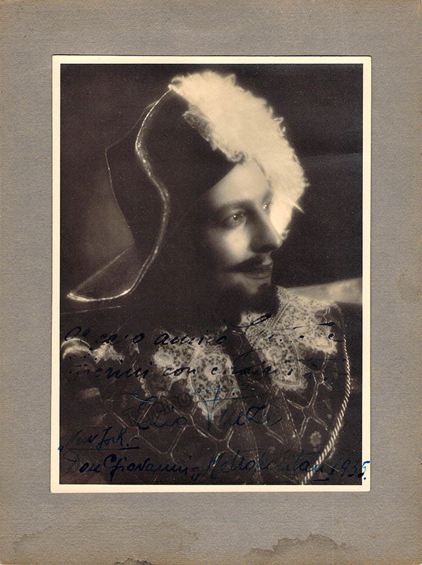 Signed photograph, shown in the title role of Mozart's Don Giovanni, dated at the Metropolitan Opera, New York in 1935. This is a 5 x 6.5 inch photo mounted on soft cardboard, total item size is 6.5 x 8.75 inches, some stains on the bottom cardboard (not the photo itself), otherwise in very good condition.
