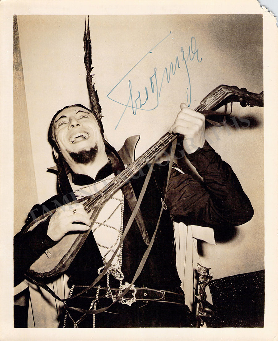 Signed photograph, shown as Mephistopheles in Gounod's Faust. Size is 5 x 7 inches, small crease on bottom right, otherwise in excellent condition.