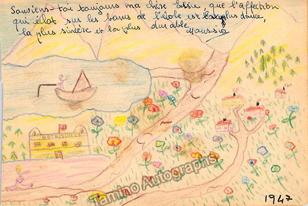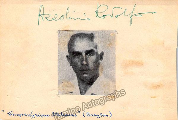 Italian baritone (1916-?), autograph note signed with attached half-tone photo, shown as himself (photo is taped onto an album page with signature on the top of the page above the photo).  Additional inscription on verso, dated in 1947 with attractive hand-written drawing of a countryside and river with a boat. Size is 4 x 6 inches, in excellent condition.