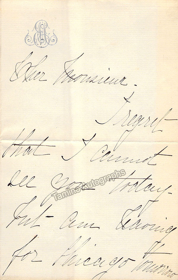 American soprano (1860-?), autograph letter signed on embossed letterhead. 2 pages, written in English. Size of each page is 4.5 x 7 inches, mounting traces on back page (which contains no text), otherwise in excellent condition.