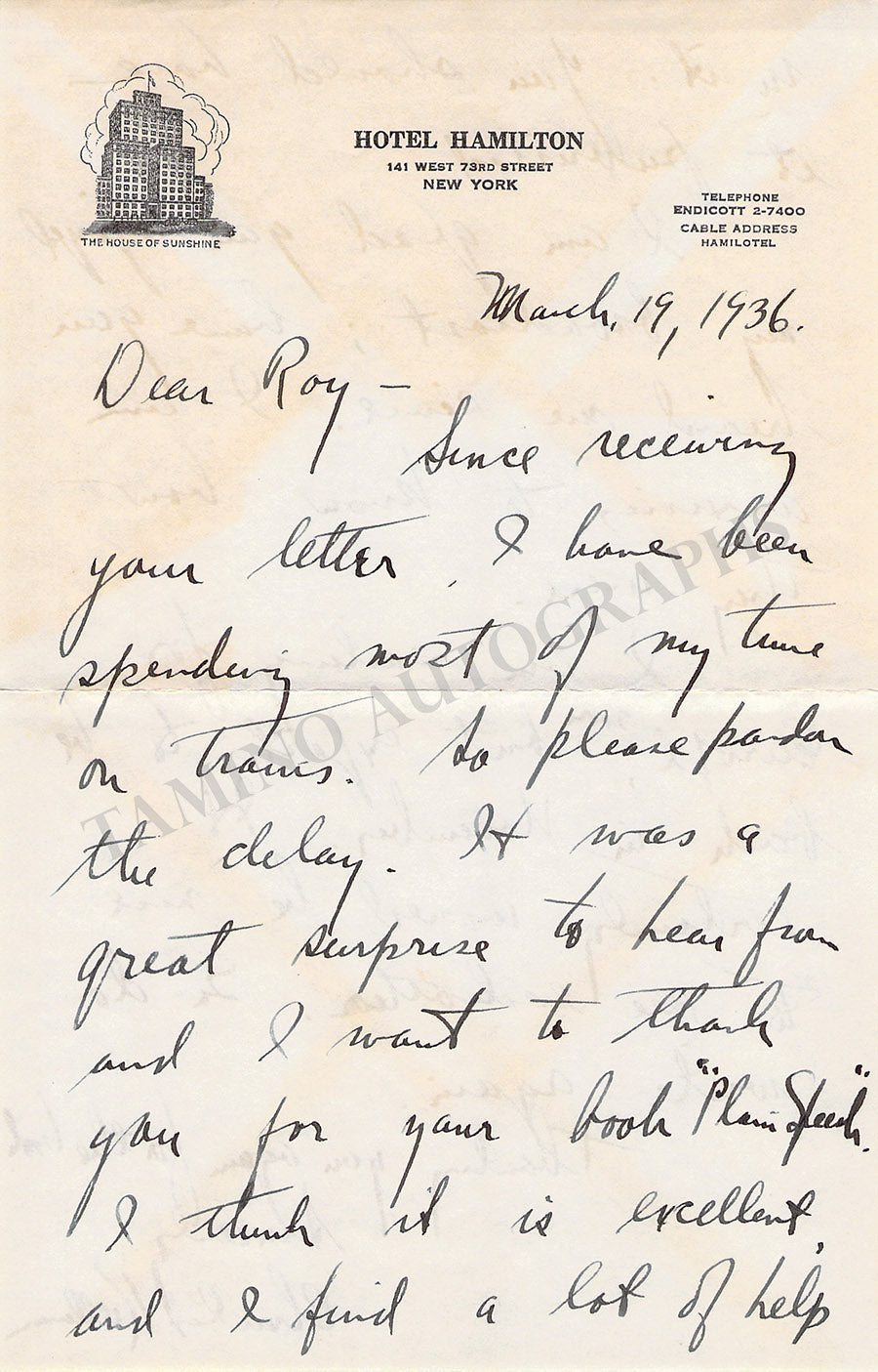 American tenor (1903-1983), who had a long career, including 25 seasons at the Metropolitan Opera in New York. Autograph letter signed, 2 pages written on the stationary of the Hotel Hamilton, New York. Size is 5.5 x 8.5 inches, in excellent condition.