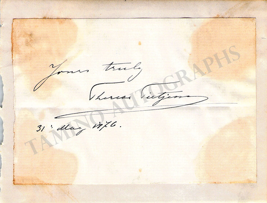 A card signed by her, dated on May 31, 1876, and mounted on an autograph album page.  Size is 5.9 x 3.8 inches, rust stains, in good condition.