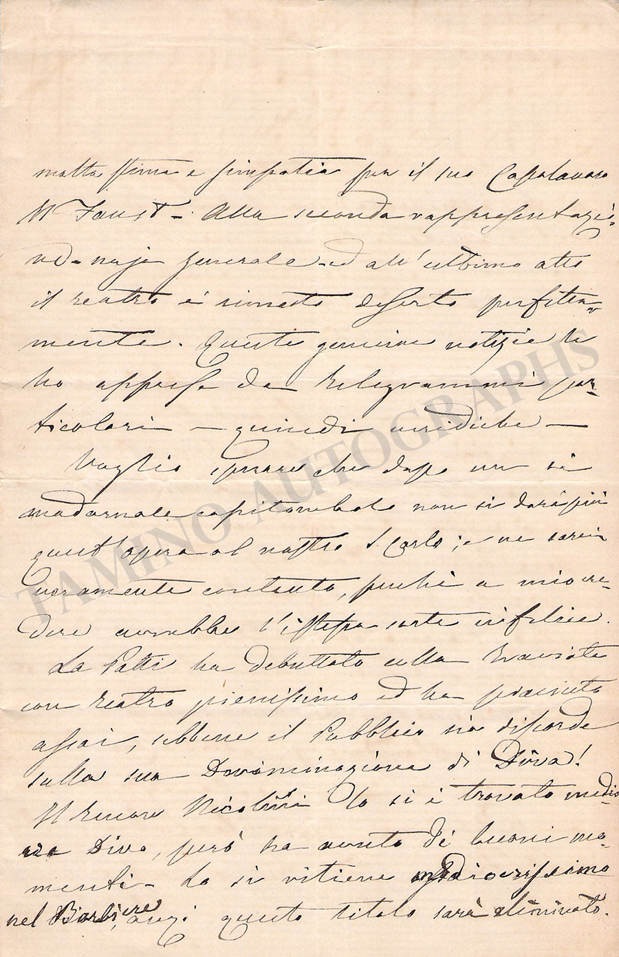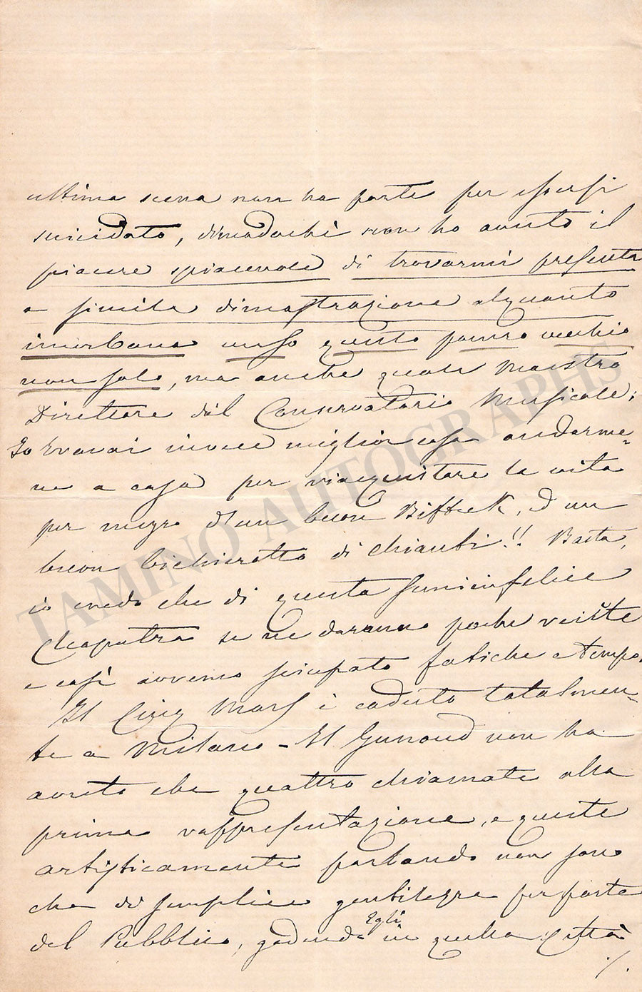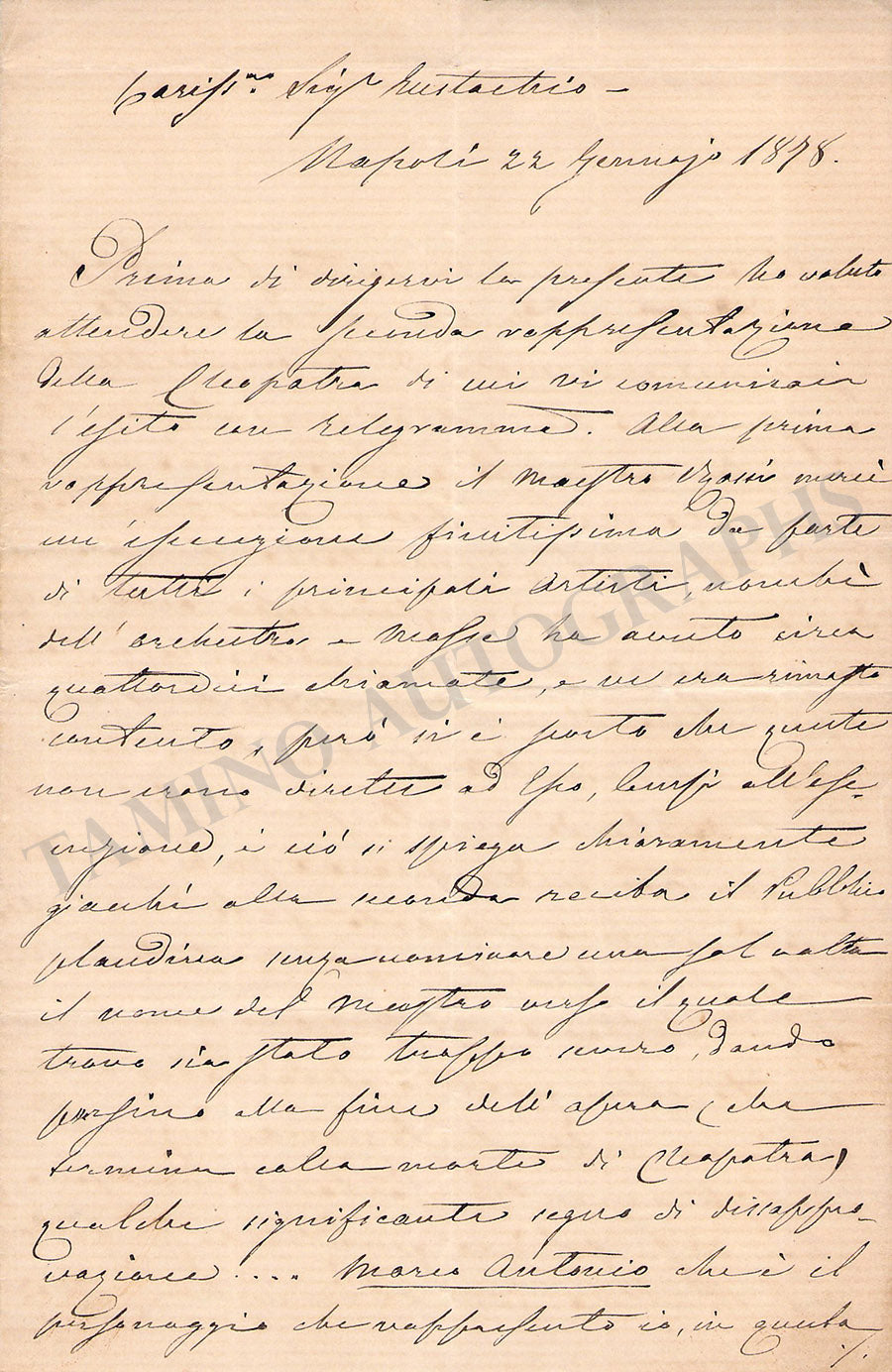 Autograph letter in Italian (untranslated) signed by him, dated in Naples, 1878 addressed to Mr. Eustachio in Naples, concerning the 1878 performance of the opera Cleopatra at the Teatro San Carlo in Naples, commenting also on other performances.