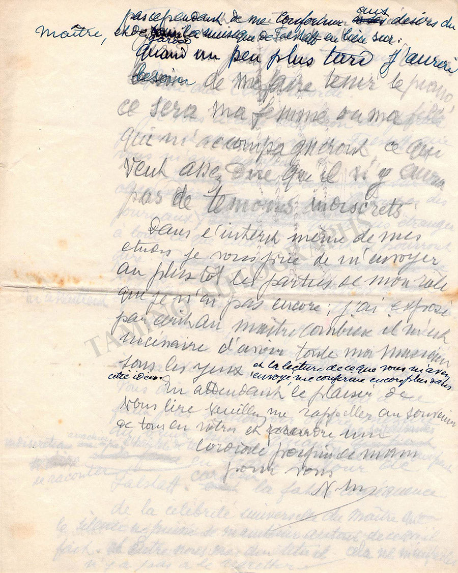 Manuscript of a future letter addressed to Tito Ricordi written by the singer and signed by him with his initialized signature, where he mentions Verdi's last opera Falstaff. Size is 5.5 x 7 inches, 2 written pages in one folded sheet, in very good condition.