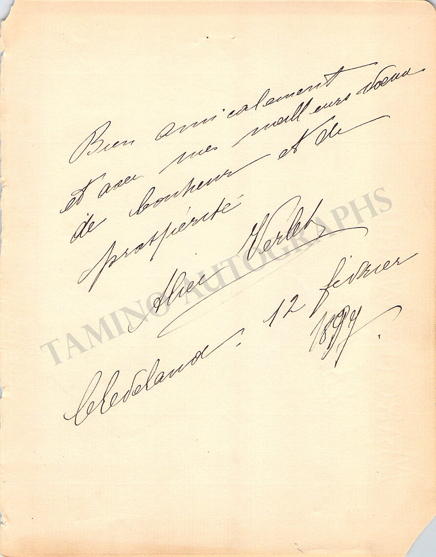 Album page signed by her with a short sentiment in French, dated in Cleveland, February 12, 1897. Size is 6 x 7.7 inches, small loss of paper over the lower-right corner, otherwise in excellent condition.