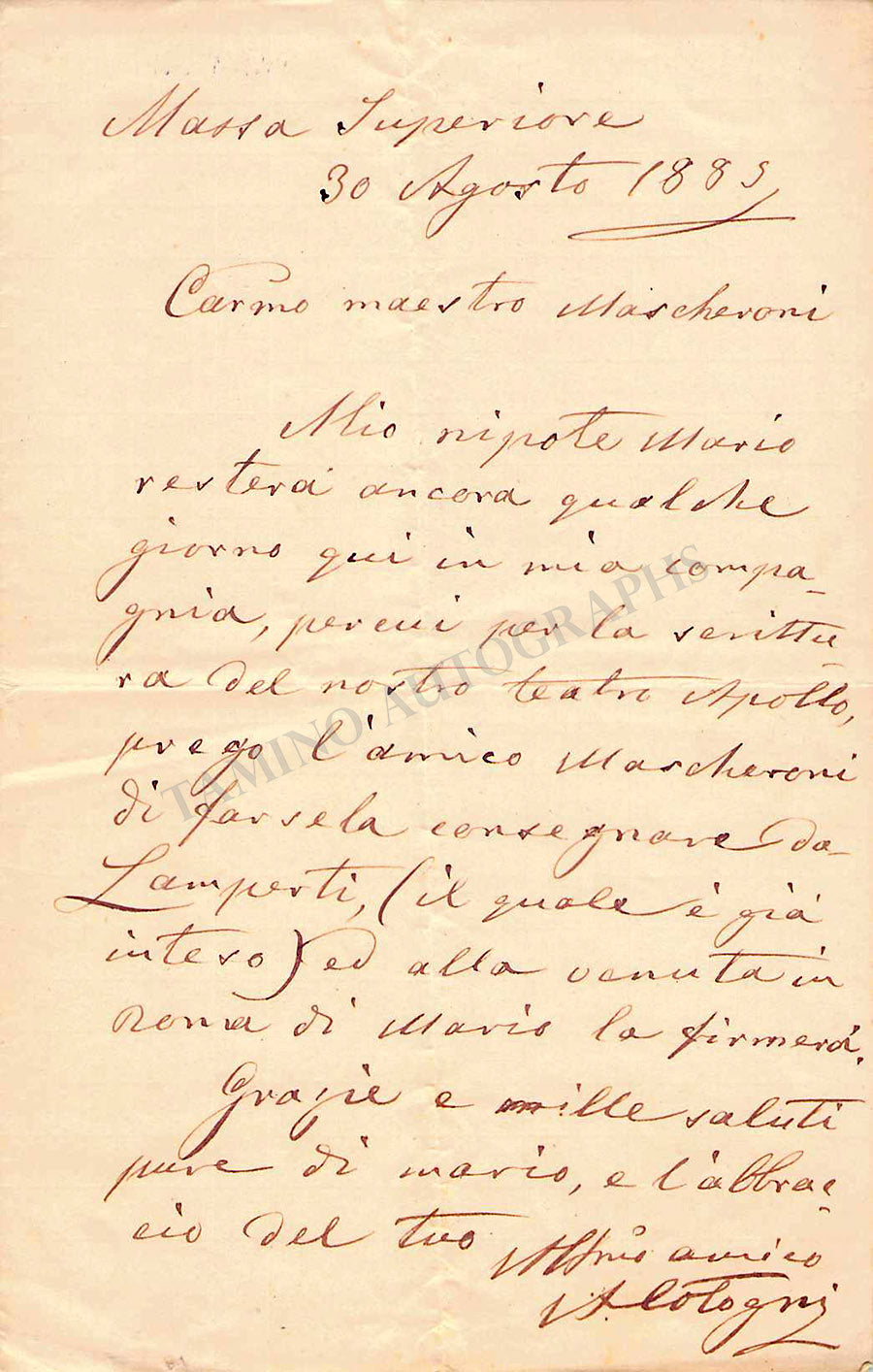 Autograph letter in Italian (sold untranslated) signed by him in 1885, addressed to his friend the Italian conductor Edoardo Mascheroni. Size is 5.25 x 8.25 inches, 1 written page, in very good condition.