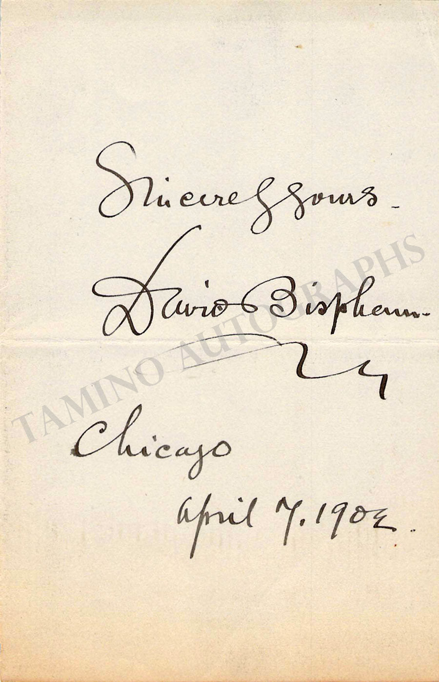 Album page nicely signed by him with a short sentiment dated in Chicago, 1904. Size is 4.5 x 69 inches, in excellent condition.