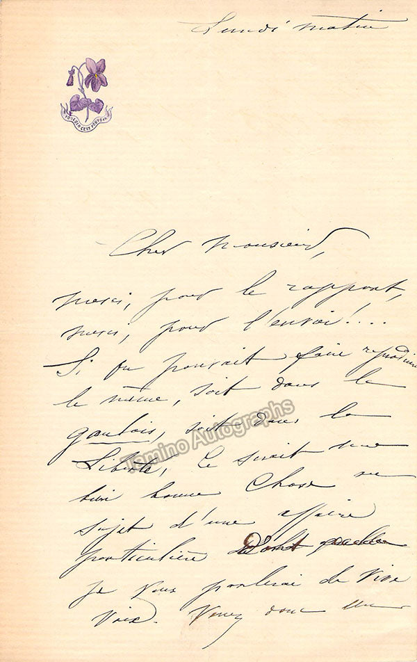 Autograph letter signed by her, written in French (sold untranslated), no date. Size is 5.25 x 8.2 inches, 2 written page in one sheet, folds, in excellent condition.