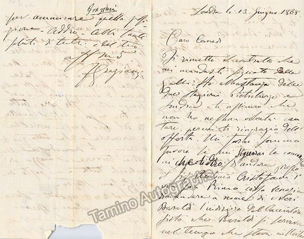 Autograph letter signed, dated in London in 1868, in Italian, sold untranslated. Size is 5.25 x 8.25 inches, four pages, in very good condition.