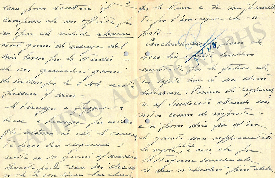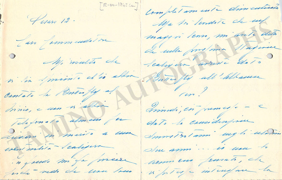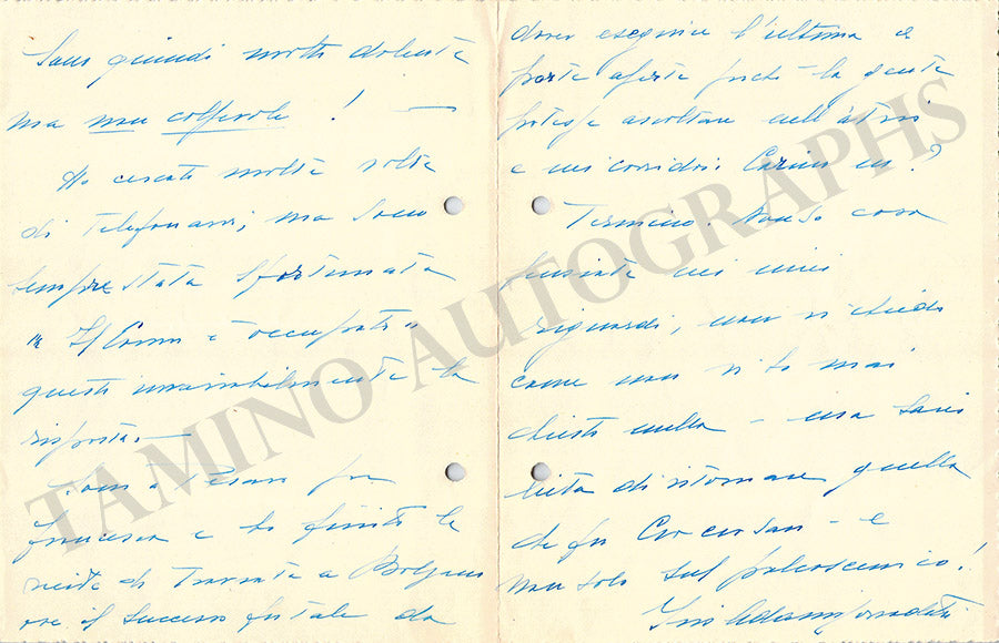 Nice set of 2 autograph letters in Italian (untranslated) signed by her. Both are 5.9 x 7.5 inches in size, 6-page-long (in blue ink), no date; 8-page-long, and dated 1942(in black ink), both in excellent condition.