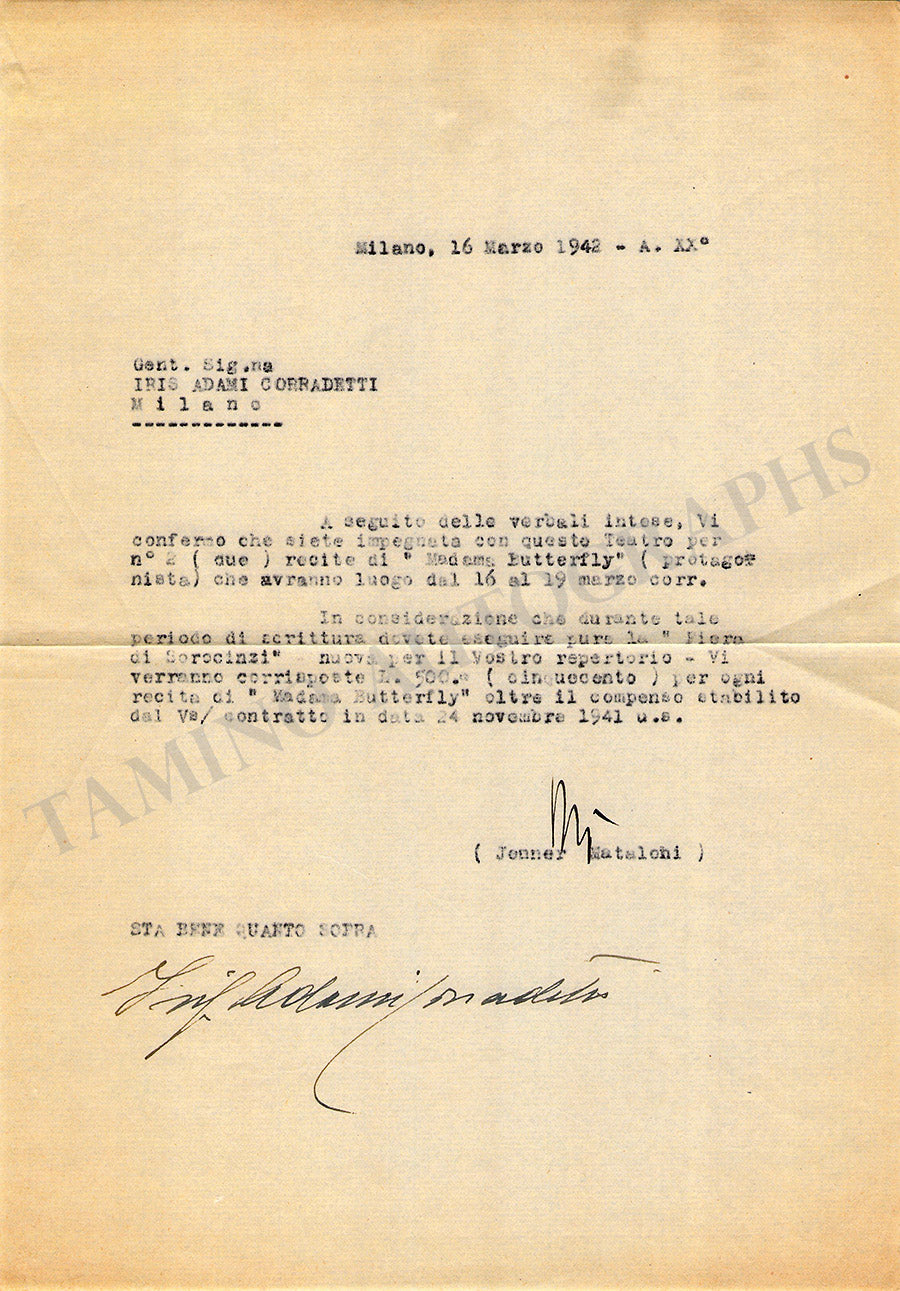 Plus one typed letter in Italian (untranslated) signed by her, dated 1942, size is 7. 7 x 10.9 inches, 1 page, in excellent condition.