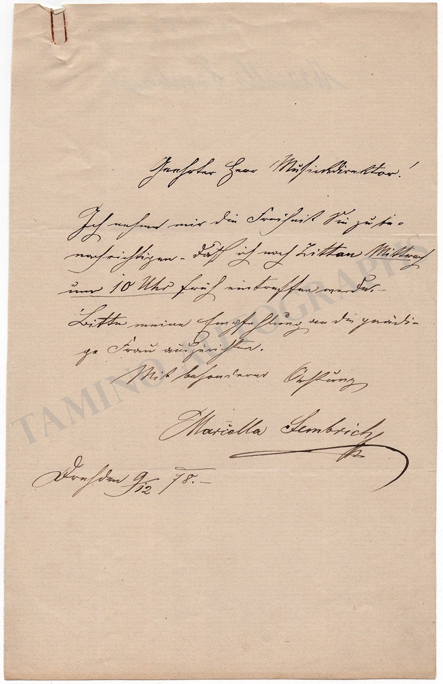 Autograph letter in German signed by her, dated 1878, where she mentions a pending appointment. Size is 5.5 x 8.7 inches, 1 written page, in very good condition.