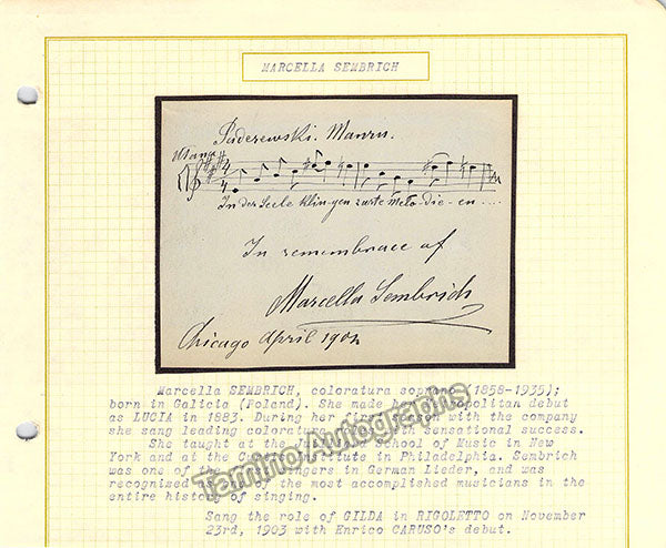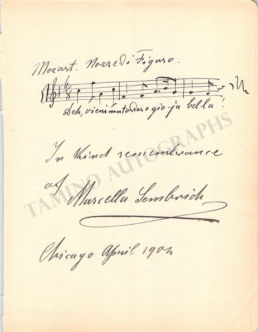Autograph music quote on an album page signed by her with a short sentiment and 3 bars from Mozart's Le Nozze di Figaro, dated in Chicago, April 1904. Size is 5.8 x 7.7 inches, in excellent condition.