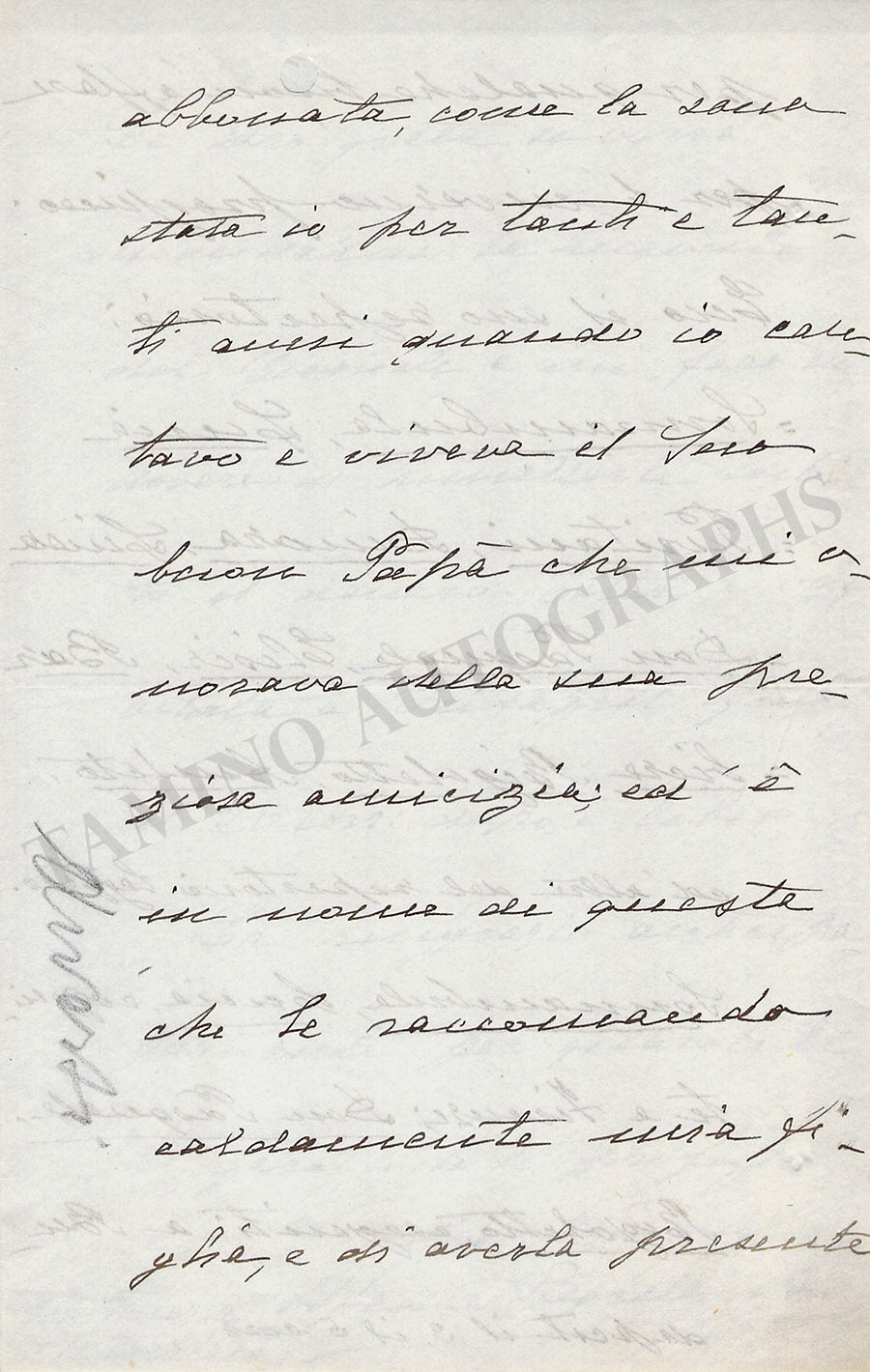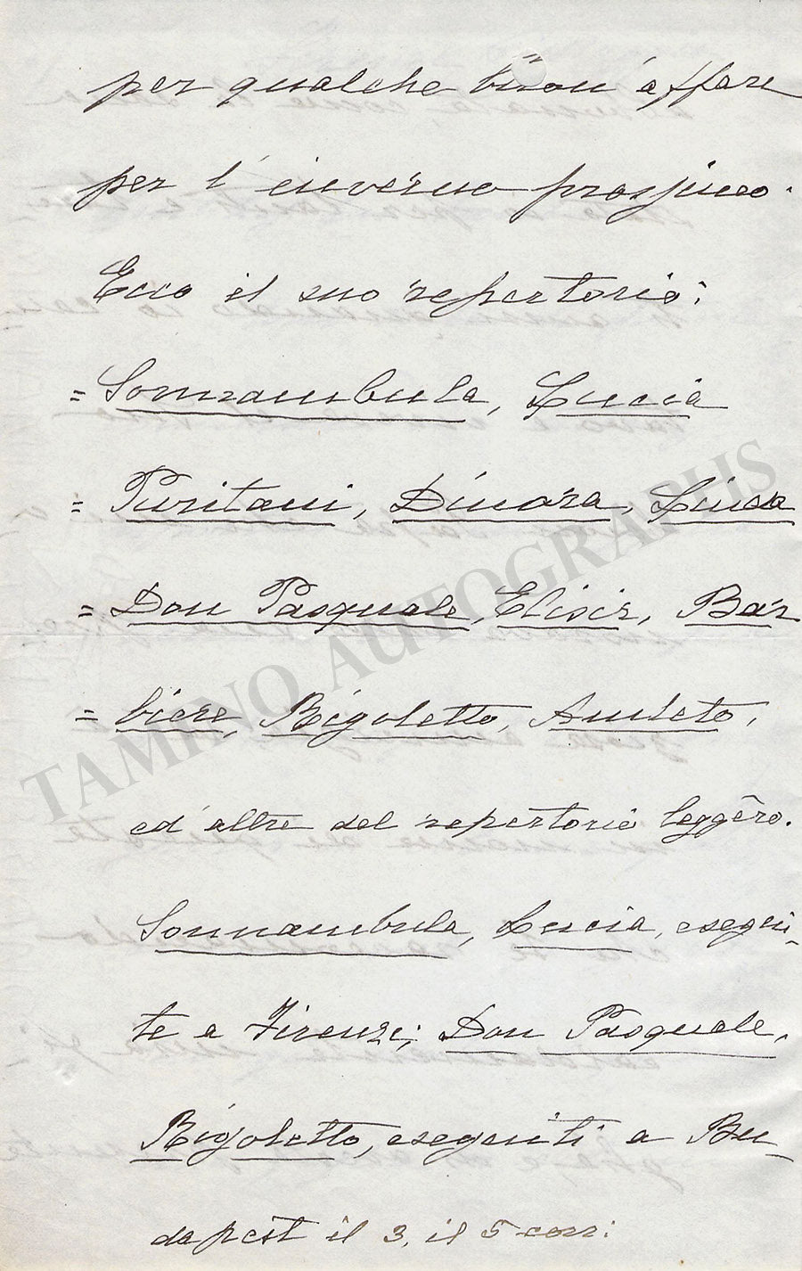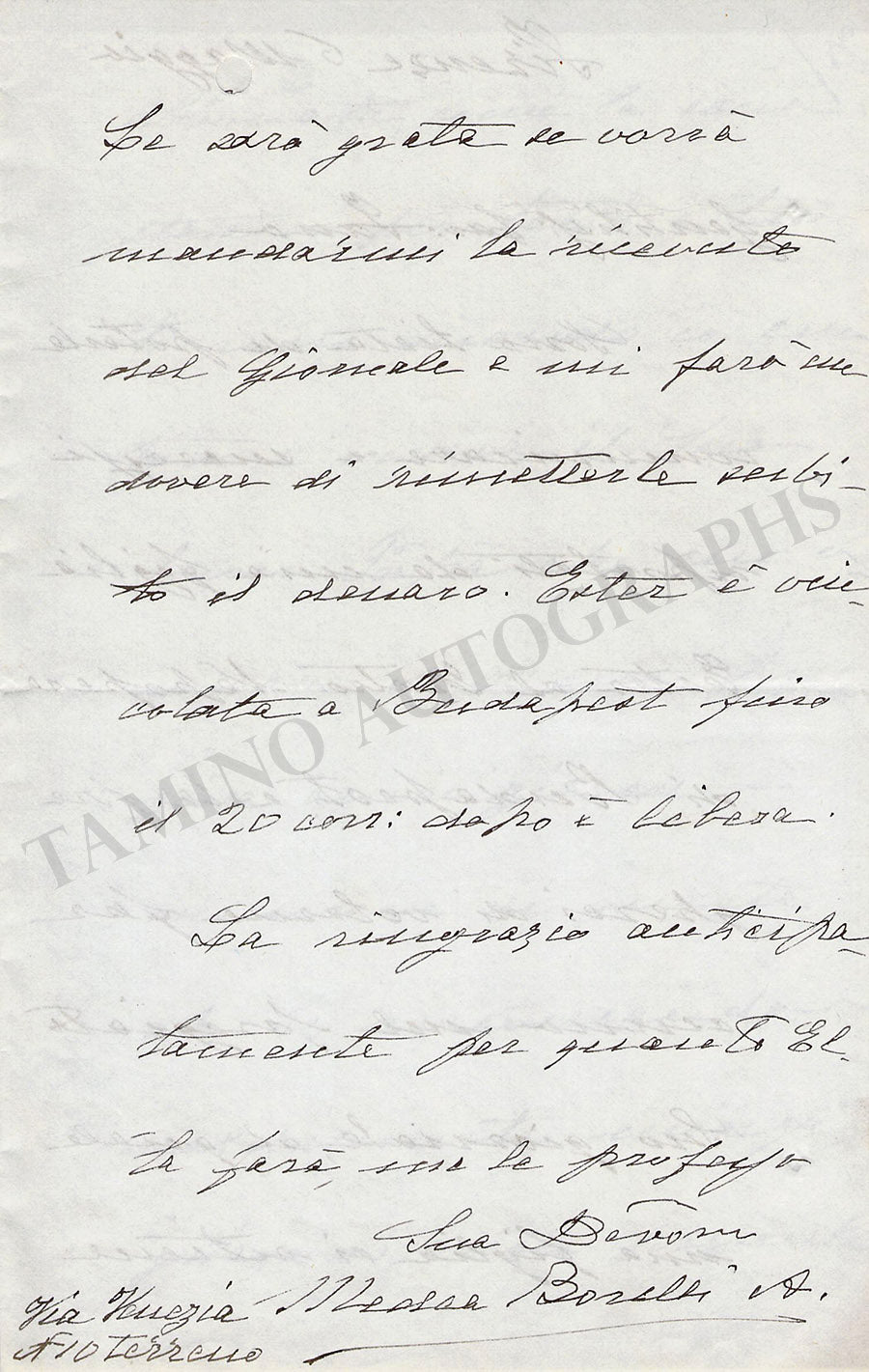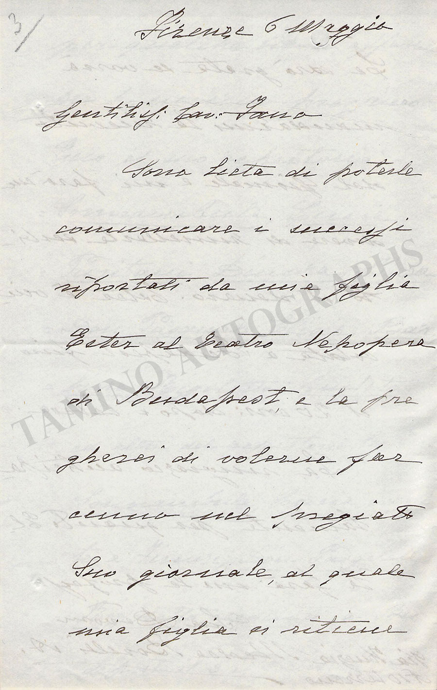 Autograph letter in Italian (untranslated) signed by her, no year indicated, addressed to Franco Fano where she recommends her daughter and informs about her success at the Budapest opera to keep her in mind for future engagements.